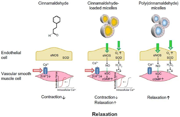 肉桂醛和含有肉桂醛的胶束以不同的机制放松冠状动脉。肉桂醛抑制Ca2+流入并降低血管平滑肌细胞的Ca2+敏感性(左),而含有聚合原药聚(肉桂醛)的胶束通过释放NO和H2O2引起内皮依赖性的松弛(右)。装有肉桂醛的胶束通过两种机制引起松弛(中间)。因此,这两种胶束可用于缓解冠状动脉血管痉挛和治疗性药物输送。[1]