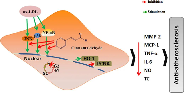 肉桂醛(Cin),作为一种从肉桂树皮中分离出来的传统风味成分,已被普遍用于--消化系统、心血管和免疫系统疾病。血管平滑肌细胞(VSMCs)的病变加速了动脉硬化的进展。在我们的研究中,我们发现肉桂醛能显著抑制ox-LDL诱导的VSMCs增殖、迁移和炎症细胞因子的过度产生,以及VSMCs和巨噬细胞中泡沫细胞的形成。此外,肉桂醛抑制了p38、JNK和p65 NF-κB的磷酸化,增加了血红素加氧酶-1(HO-1)的活性。此外,肉桂醛减少了单核细胞趋化蛋白-1(MCP-1)、基质金属蛋白酶-2(MMP-2)和凝集素样氧化低密度脂蛋白受体-1(LOX-1)的表达。此外,肉桂醛使细胞周期停止在S期。因此,结果表明,肉桂醛通过调节HO-1、MMP-2、LOX-1和阻断细胞周期,以及抑制p38、JNK/MAPK和NF-κB信号通路,拮抗了牛-LDL诱导的VSMCs增殖、迁移、炎症和泡沫细胞的形成。[2]