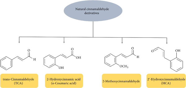 肉桂粉是最著名的香料之一,由肉桂树的内树皮制成。最常见的品种是C. cassia(中国肉桂)和C. verum(真肉桂)。这两个品种含有85.3%和90.5%的肉桂醛(CA)。CA是肉桂树皮提取物的一种主要生物活性物质,负责肉桂的气味和味道。1834年Jean-Baptiste Dumas和Eugène-Melchior Péligot首次从肉桂中分离出这种成分,然后由意大利化学家Luigi Chiozza于1854年在实验室合成。因此,CA可以从天然提取物中获得或在实验室中合成。天然CA衍生物包括反式肉桂醛(TCA)、2-羟基肉桂醛(HCA)、2-甲氧基肉桂醛(MCA)和2-羟基肉桂酸(o-Coumaric acid)(如下图)。[3]