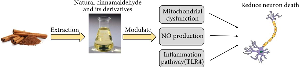肉桂醛提取及通过抑制线粒体功能障碍、亚硝酸盐氧化物(NO)产生和炎症途径减少神经细胞死亡示意图