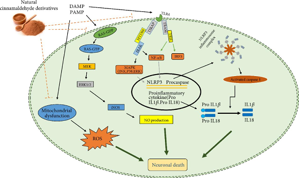 肉桂醛对神经炎症、氧化应激和线粒体功能障碍的神经保护作用。PAMP:病原体相关的分子模式;DAMP:损伤相关的分子模式[3]